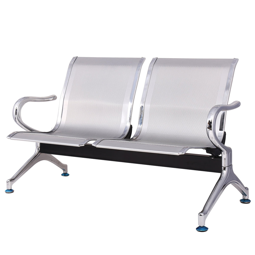 Panca per sala d'attesa in acciaio microforato con trattamento antiruggine e verniciatura elettrostatica. Spessore lamiera 1,5mm. Profili, gambe e braccioli in acciaio cromato.