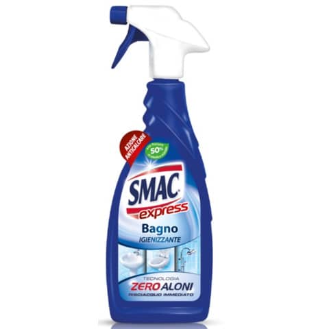 Smac - Bagno Igienizzante. Prodotto ideato per rimuovere facilmente lo sporco ostinato e il calcare da tutte le superfici del bagno. Grazie alla tecnologia zero aloni garantisce uno splendore imbattibile, si risciacqua in una passata e lascia le superfici pulite, brillanti e senza aloni. La sua formula agisce rimuovendo con efficacia tracce di calcare, macchie d'acqua e residui di sapone. Indicato per igienizzare e lasciare le superfici brillanti a lungo. Modalità di utilizzo: spruzzare il prodotto sulla superficie da pulire e lasciare agire, successivamente risciacquare con un panno o una spugna umidi. Per uno splendore imbattibile passare con un panno asciutto. Disponibile in Eco-flacone realizzato con il 50% di plastica riciclata, smaltire il prodotto esaurito nella plastica. Contenuto: 650 ml.