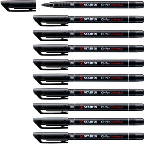 Penna OHPen ideale per lucidi e per quasi tutte le superfici lisce (cd-rom, DVD, plastica, vetro, metallo e ceramica). Impugnatura zigrinata, fondello e cappuccio ventilato con clip nel colore dell'inchiostro. Punta media, ampiezza di tratto 1 mm, inchiostro permanente di colore nero.