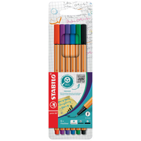 Fineliner con punta extrafine rinforzata in metallo tratto da 0,4 mm. Dotato di cappuccio ventilato antisoffocamento. Dura a lungo anche senza cappuccio. 6 colori assortiti.