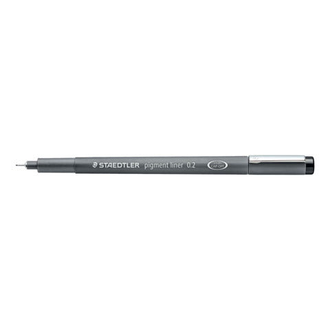 Penna Pigment Liner 308 a punta sintetica graduata 0,2 mm. per scrittura e disegno tecnico, inchiostro pigmentato per documenti; colore nero intenso. Può rimanere senza cappuccio per 18 ore senza seccare (test ISO 554). Airplane-safe. Lunga punta in metallo ideale per righe.