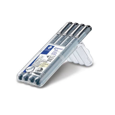 Penna Pigment Liner 308 a punta sintetica graduata per scrittura e disegno tecnico, inchiostro pigmentato per documenti; colore nero intenso. Può rimanere senza cappuccio per 18 ore senza seccare (test ISO 554). Airplane-safe. Lunga punta in metallo ideale per righe. Set da 4 misure: 0,1 - 0,3 - 0,5 - 0,7 mm.