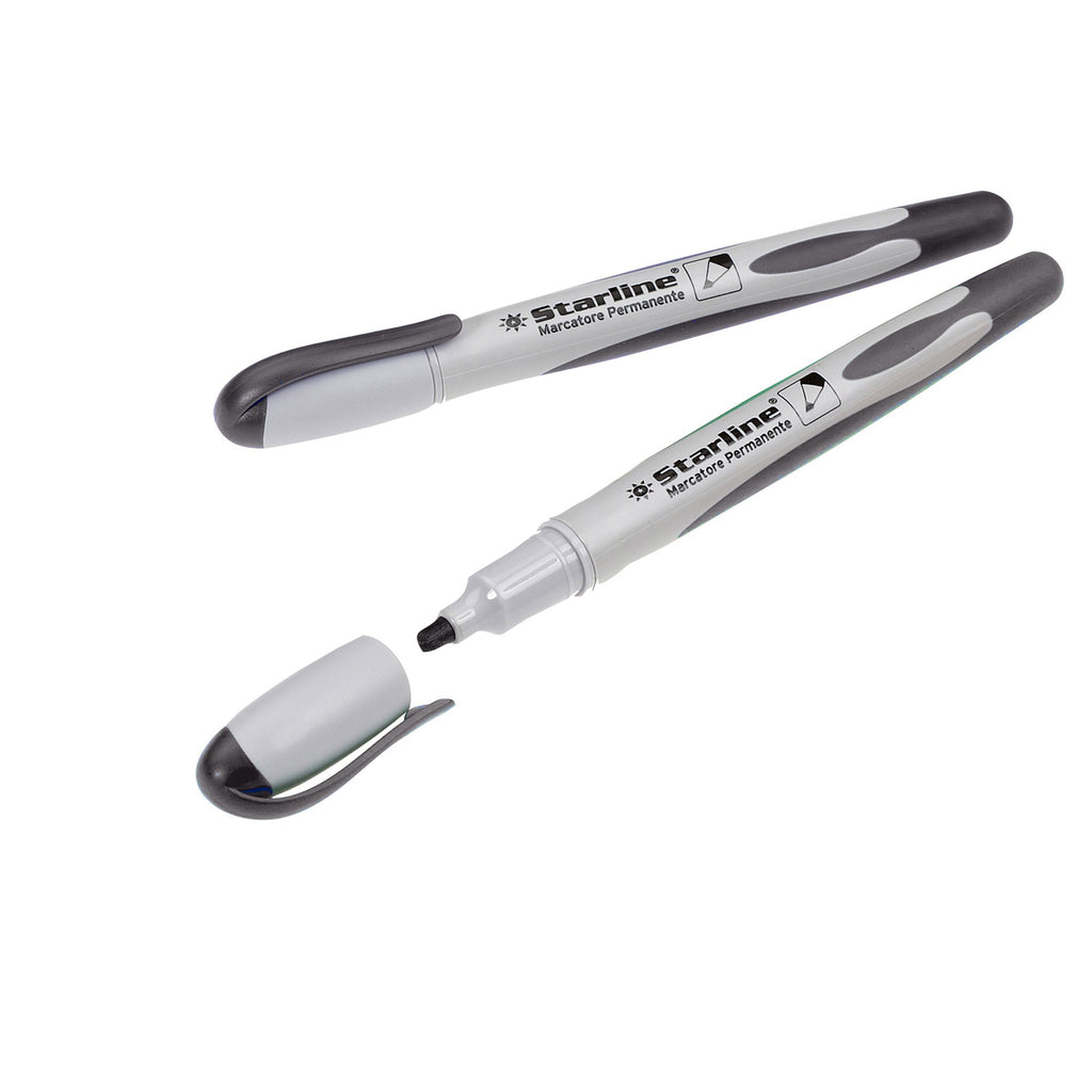 Marcatore permanente con fusto bicolore. Cappuccio con clip nel colore dell'inchiostro. Punta tonda tratto 1-2mm.