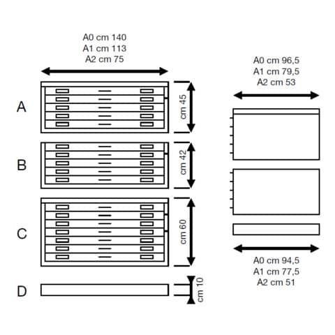Cassettiera orizzontale realizzata in metallo a 5 cassetti. Con serratura. Completa di top e zoccolo. Formato A0. Apertura cassetti a scorrimento su cuscinetti. Verniciatura epossidica. Altezza interna del cassetto 5,5 cm. Portata massima cassetto 40 kg. Colore bianco (RAL 9016). Disponibili altri colori su richiesta (RAL 7035/RAL 9005). Dimensioni: 140 x 96,5 x 55 cm. Peso netto: 108 Kg. Peso con gabbia: 127 Kg Misure cassetti: 130 x 92 x 5,5 cm.