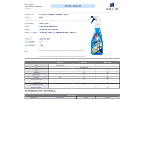 Vetril multisuperficie grazie alla sua formula sgrassa a fondo con la forza dell’ammoniaca, pulisce e rende brillanti le superfici senza lasciare aloni. Adatto alla pulizia di tutte le superfici lavabili senza bisogno di risciacquare. Contenuto: 650 ml.