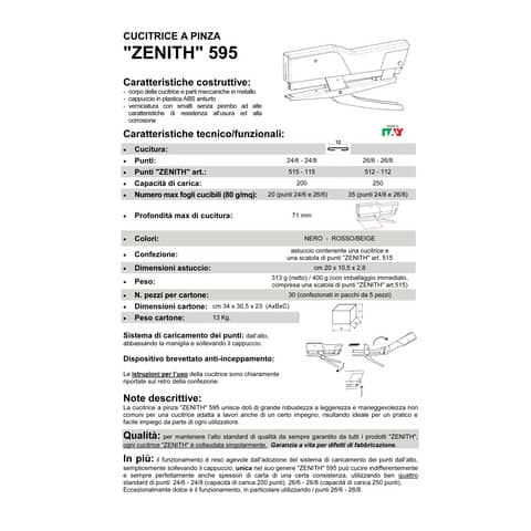 Cucitrice con corpo e parti meccaniche in metallo e cappuccio in plastica ABS antiurto colorato. Verniciatura con smalti senza piombo, altamente resistente all'usura ed alla corrosione. Collaudata singolarmente e garantita a vita per difetti di fabbricazione. Capacità di carica 200-250 punti. Cuce a punto chiuso fino a 20 fogli con punti 24/6 e fino a 35 fogli con punti 24/8. Caricamento punti dall'alto. Dispositivo brevettato anti-inceppamento.Rosso/beige