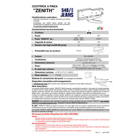 La versione Jeans della cucitrice “Zenith” 548/E presenta caratteristiche estetiche e sfumature di tonalità analoghe al tessuto Denim, proprio quello dei pantaloni Jeans. Anche le superfici del corpo e della maniglia presentano una leggera, piacevole rugosità, che ricorda quella del tessuto. Edizione speciale a tiratura limitata, cartoncino inserito all’interno della confezione (che ricorda l’etichetta dei jeans). Capacità di carica 100 punti. Cuce a punto chiuso fino a 15 fogli con punti 6/4 e fino a 30 fogli con punti 6/6. Spingi punti estraibile. Dispositivo brevettato anti-inceppamento.