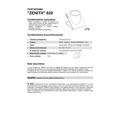 Il nuovo portapenne Zenith 820 è un oggetto dal design unico ed insolito, caratterizzato da linee semplici ed essenziali, la cui forma innovativa è protetta a livello brevettuale come modello di utilità. È costituito da due componenti realizzati interamente in metallo, con il cilindro portapenne nichelato e la base di sostegno verniciata. Le verniciature sono tutte realizzate con smalti senza piombo ad alte caratteristiche di resistenza all’usura ed alla corrosione. Il portapenne Zenith 820 garantisce una stabilità assoluta in ogni situazione, assicurata dalle dimensioni e dalla robustezza della base all’interno della quale è inserito il contenitore portapenne. La praticità si unisce al design per una nuova collezione ricercata, moderna e funzionale. La linea di accessori da scrivania Zenith è 100% Made in Italy e perfetta per chi sulla propria scrivania cura ogni dettaglio. Dimensioni: Cilindro portapenne Ø (interno) 67 mm, dimensioni complessiva cm 12,2 x 10 x 9,2. Colore bianco.